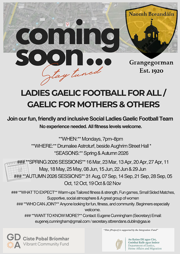 31Jan2026 - Hopefully the bank holiday weekend is going well. Over the last while St Brendan's has been looking for a steady slot and location from 7 to 8pm on a Monday for Ladies Social Gaelic Football. We have been working on the coaching support for this slot and we have secured an astroturf slot that we can use and a knowledgeable coach, who is looking forward to helping out.If you are interested we were hoping to start in March for those that are able to make it. please see the form attached for sign-up . expression of interest -